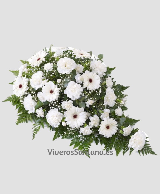 Bonito y fino este Centro Lágrima tonos Blancos para entrega en los Tanatorios. Es un centro funerario de flores variadas, en tonos blancos, confeccionado con gerberas, claveles y paniculata y verdes variados que le dan al centro un toque dulce y delicado. Si quieres enviar flores blancas al tanatorio, nuestros centros de flores para difuntos se envían de nuestras floristerías a los Tanatorios como muestra de cariño, aprecio y acompañamiento para la familia de la persona fallecida.