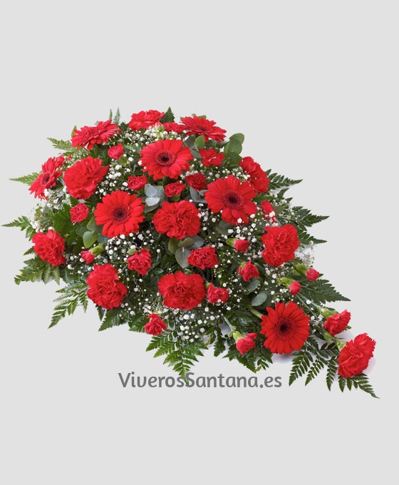 Bonito centro de funeral, llamado Centro Lágrima tonos Rojos para entrega en los todos los Tanatorios de nuestra Ciudad. Es un centro para funeral de flores de defunción variadas, en tonos rojos, confeccionado con gerberas, claveles y paniculata y verdes variados que le dan al centro un toque dulce y delicado. Si quieres comprar flores para el tanatorio o enviar flores al tanatorio, nuestros centros de flores para dar condolencias se envían a los Tanatorios como muestra de cariño, aprecio y acompañamiento para la familia de la persona que ha fallecido.