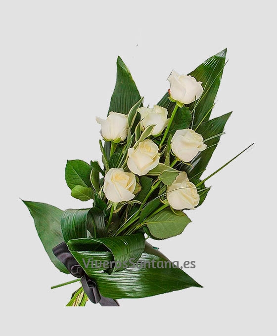 Elegante y fino Ramo Funerario de 7 Rosas blancas. Es un ramo funerario de 7 rosas de color blanco y verdes variados que le dan al ramo funerario un toque dulce y delicado (este ramo funerario incluye 7 rosas color blanco y verdes variados, celofán, lazo y cinta funeraria). Se envía a todos los Tanatorios de la provincia. Este ramo de 7 rosas de color blanco es un producto de gran calidad, con rosas blancas para entregar en funeral suministradas por nuestros proveedores de flores blancas para tanatorio, tanto nacionales como internacionales. Nuestros ramos de flores para difuntos, están siempre realizados con rosas blancas para entregar en funeral y verdes variados.