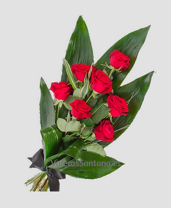 Elegante y fino Ramo Funerario de 7 Rosas rojas. Es un ramo funerario de 7 rosas rojas para entregar en el tanatorio y verdes variados que le dan al ramo funerario un toque dulce y delicado (incluye 7 rosas color rojo y verdes variados, celofán, lazo y cinta funeraria). Este ramo de 7 rosas de color rojo es un producto de gran calidad, con rosas frescas suministradas por nuestros proveedores, tanto nacionales como internacionales. Nuestro ramo funerario de 7 rosas rojas para funeral, está siempre realizado con rosas y verdes variados. Un ramo para funeral efectuados de forma totalmente artesanal por floristas profesionales, por lo que su ramo de flores para difuntos o sus flores para tanatorio quedará bonito y elegante.
