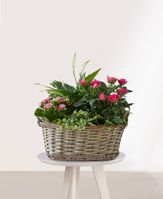 La Planta Cesta Rosal, es una elegantísima cesta para regalar, y contiene la planta Kalanchoe que le dan ese aire silvestre. También es conocida así por la resistencia de sus flores.