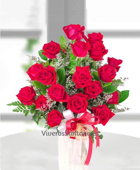 Fino y elegante es este Ramo de 18 Rosas. Esta confeccionado con 18 rosas decorado con paniculata blanca y bonitos verdes que contrastan con el siempre elegante rojo de las rosas. ¿Quieres hacer el regalo perfecto? Pues este es el momento. Sin duda, es el mejor regalo para esa persona a la que queremos ofrecerle un día inmejorable, e ideal para regalar en cualquier momento, si lo que queremos es enviar rosas rojas a domicilio. Bien sea un ramo de rosas rojas para el Día de la Madre o unas rosas rojas para San Valentín, este ramo de regalo de nuestra floristería online es la mejor opción.