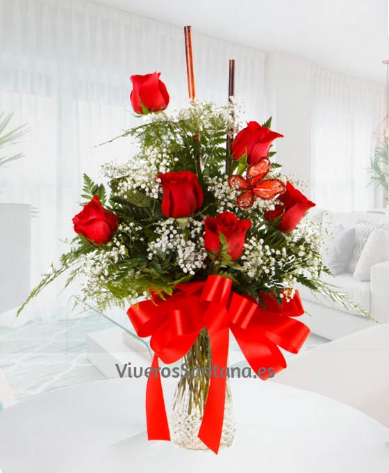 Bonito y elegante, siempre este Ramo de 6 Rosas. Regalar rosas es el regalo ideal. Esta confeccionado con 6 rosas de tallo largo y decorado con paniculata, es el mejor regalo para esa persona especial, e ideal para regalar en cualquier momento, si lo que queremos es enviar rosas rojas a domicilio. Nuestros ramos de rosas están realizados siempre con flores de primera calidad y frescas. Son suministradas diariamente por proveedores nacionales e internacionales. Los ramos de rosas para regalo, están realizados siempre por floristas profesionales, especialistas en el arte floral, por lo que siempre presentamos un producto fresco y elaborado con mucho mimo. Además, ofrecemos un servicio de envío de arreglos florales.